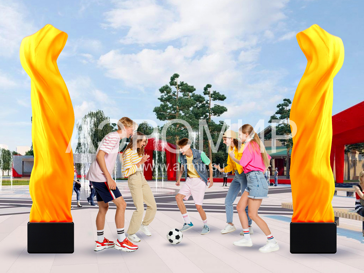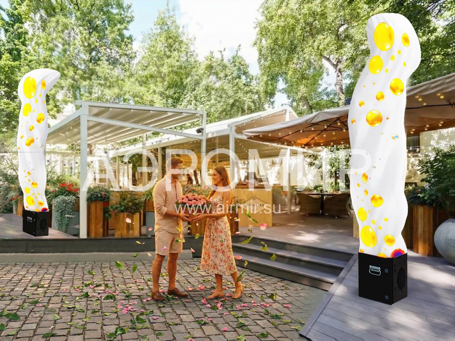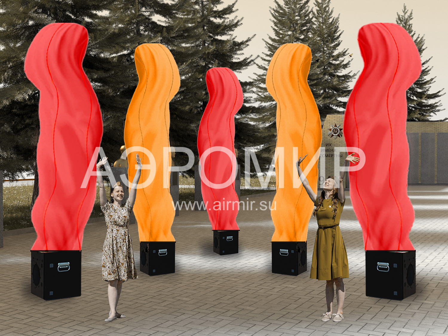 Аэрофонтан – это пример динамичного, а значит нескучного оформления праздничной площадки. Если Вы не представляете, что это такое, вспомните любой из увиденных когда-либо фонтанов. Как известно, он образуется, когда вода встречается с препятствием и из-за давления, создаваемого искусственно или естественно, устремляется вверх. Если заменить воду воздухом и ограничить его поток «трубой» из синтетической ткани, получится фонтан воздушный. Благодаря тому, что используемый материал, как правило, имеет очень гладкую, блестящую поверхность, на струящейся оболочке возникают переливы и блики, как на воде. Этот эффект заметно усиливается в вечернее время, когда можно включить встроенную подсветку.