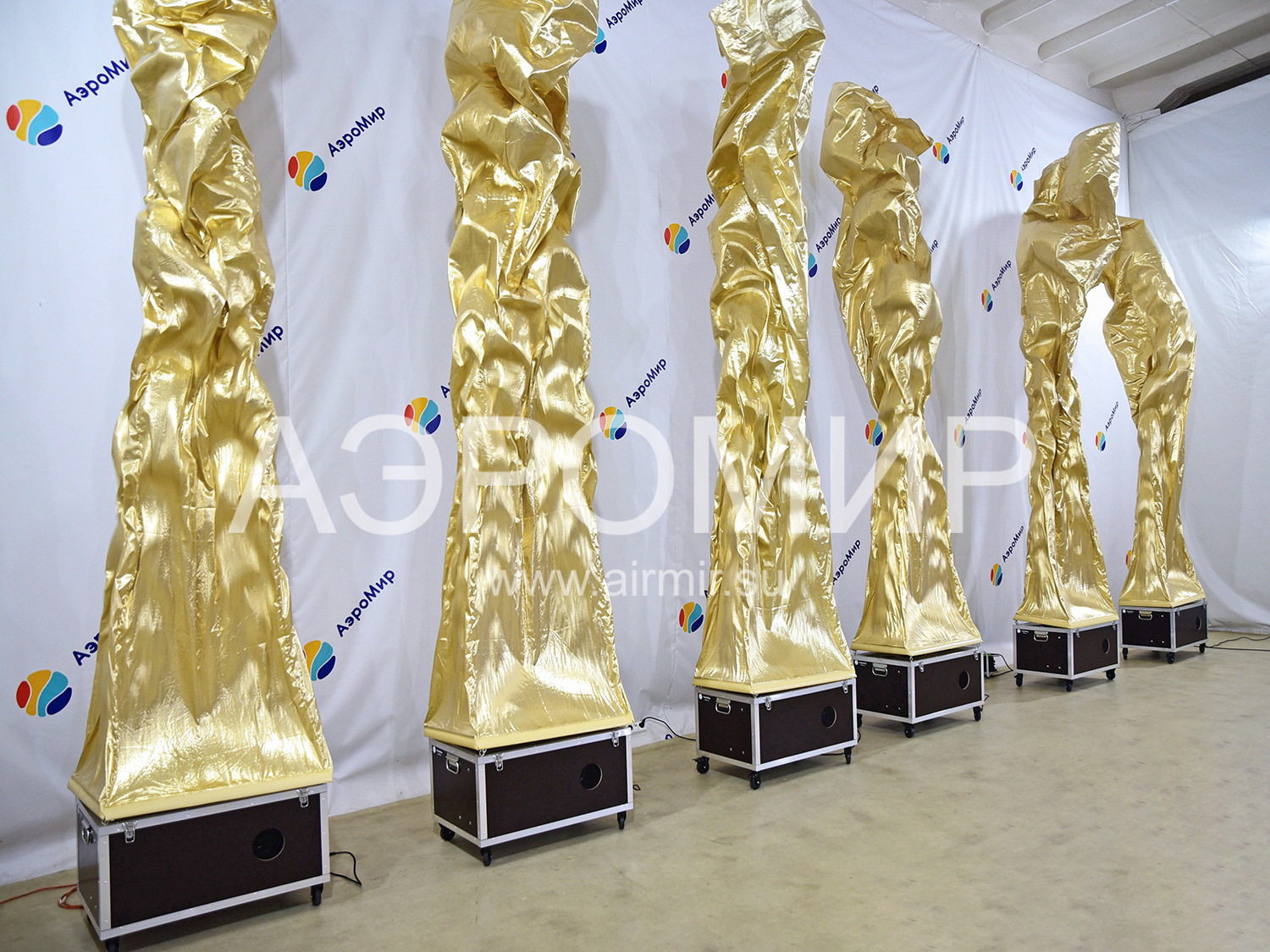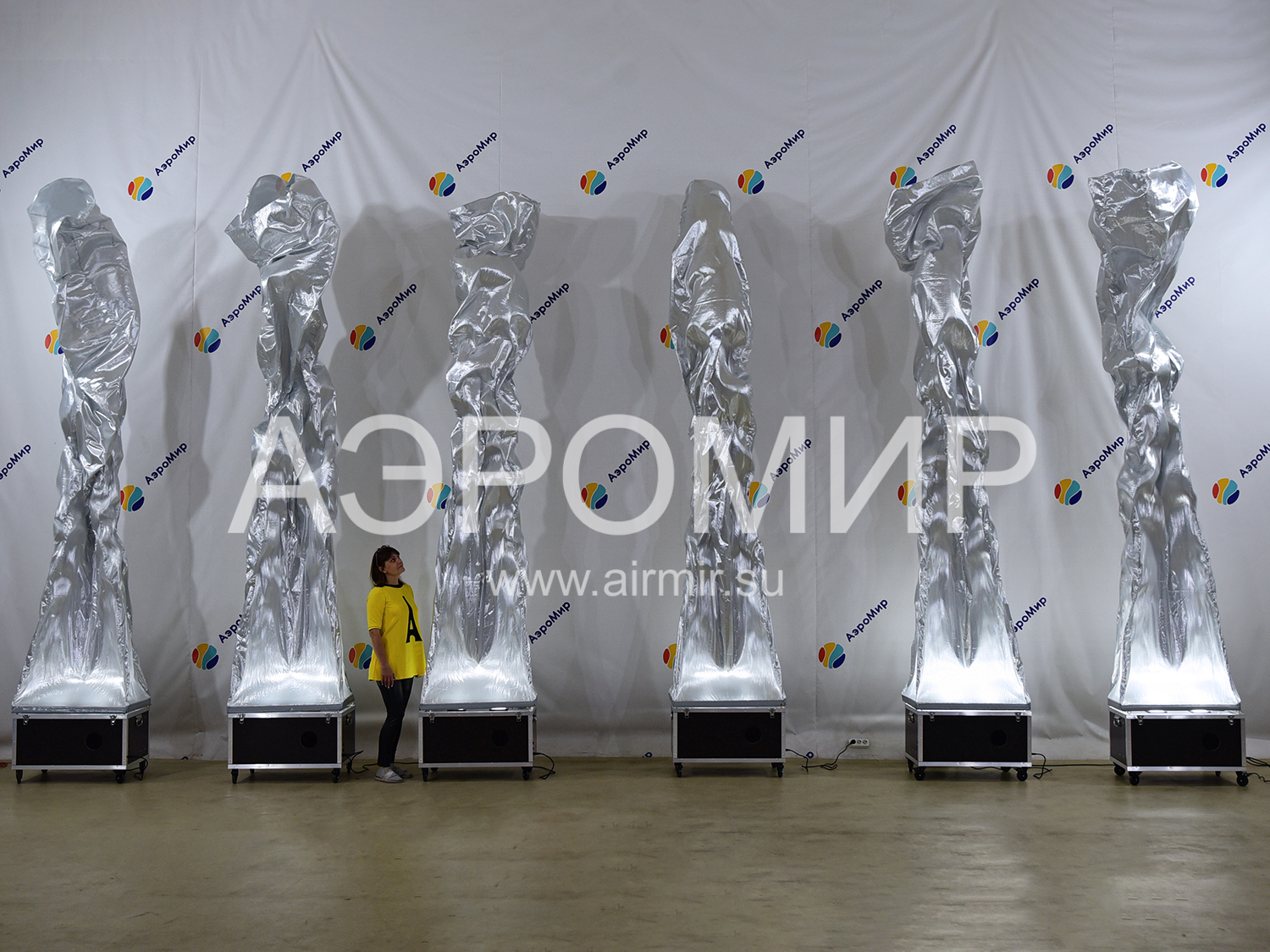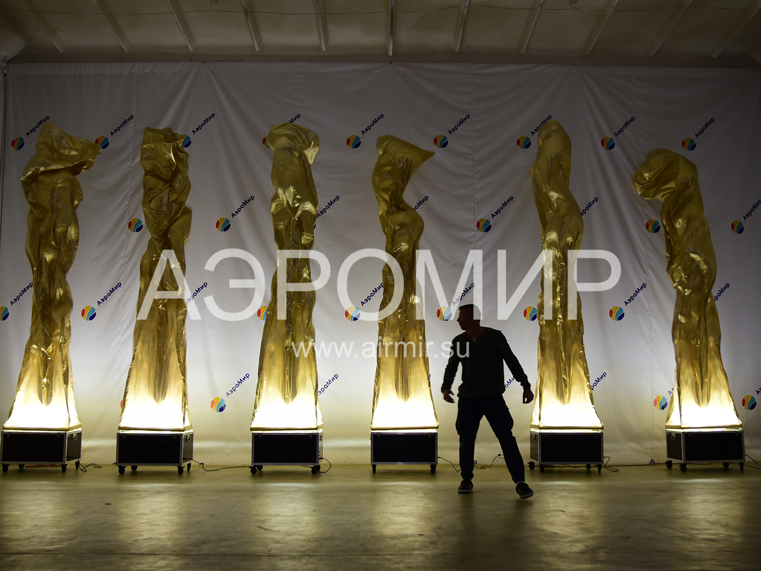 Аэрофонтан – это пример динамичного, а значит нескучного оформления праздничной площадки. Если Вы не представляете, что это такое, вспомните любой из увиденных когда-либо фонтанов. Как известно, он образуется, когда вода встречается с препятствием и из-за давления, создаваемого искусственно или естественно, устремляется вверх. Если заменить воду воздухом и ограничить его поток «трубой» из синтетической ткани, получится фонтан воздушный. Благодаря тому, что используемый материал, как правило, имеет очень гладкую, блестящую поверхность, на струящейся оболочке возникают переливы и блики, как на воде. Этот эффект заметно усиливается в вечернее время, когда можно включить встроенную подсветку.