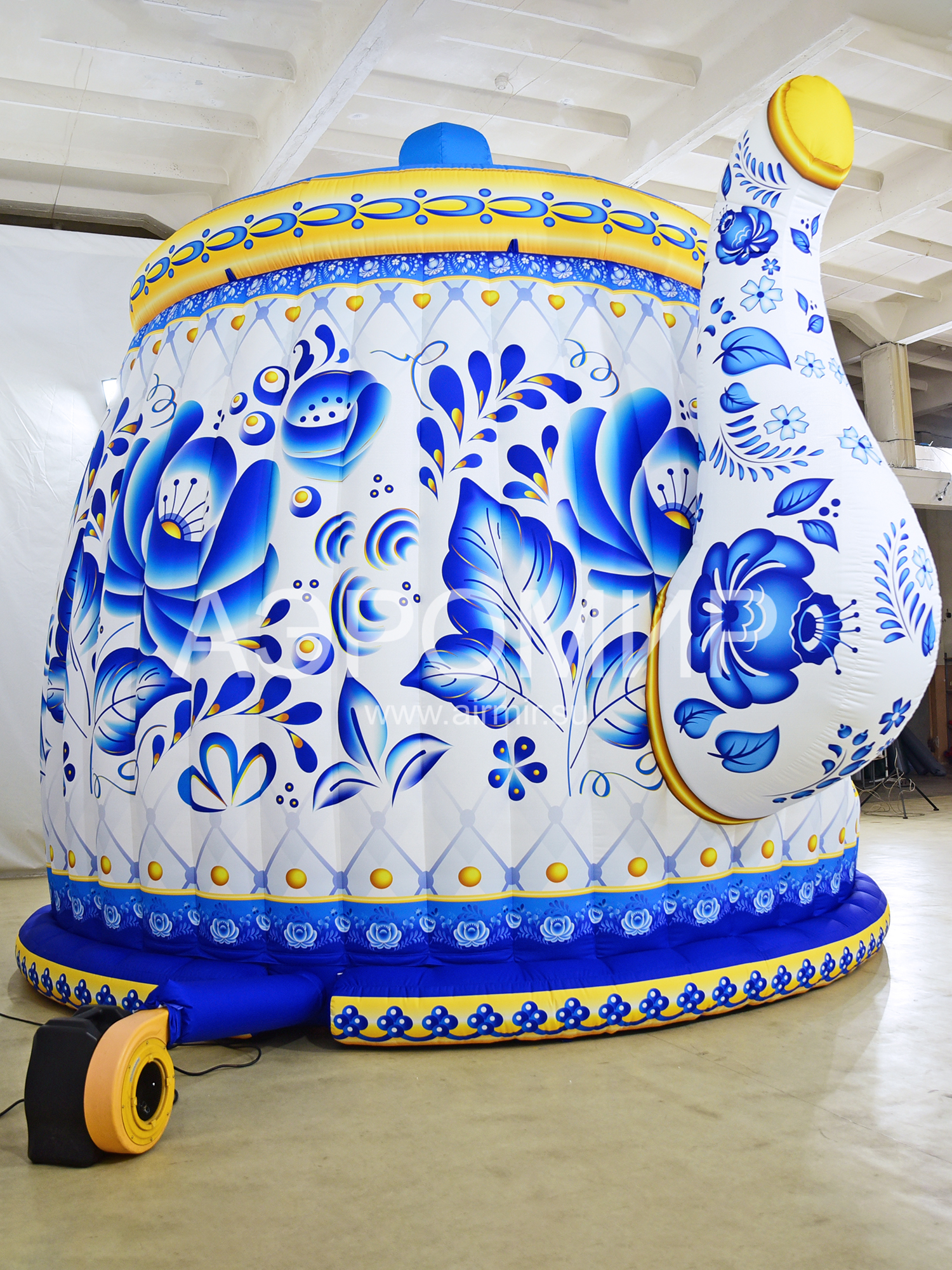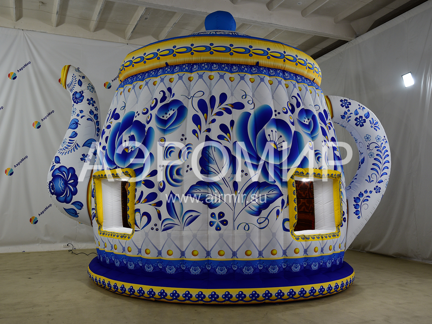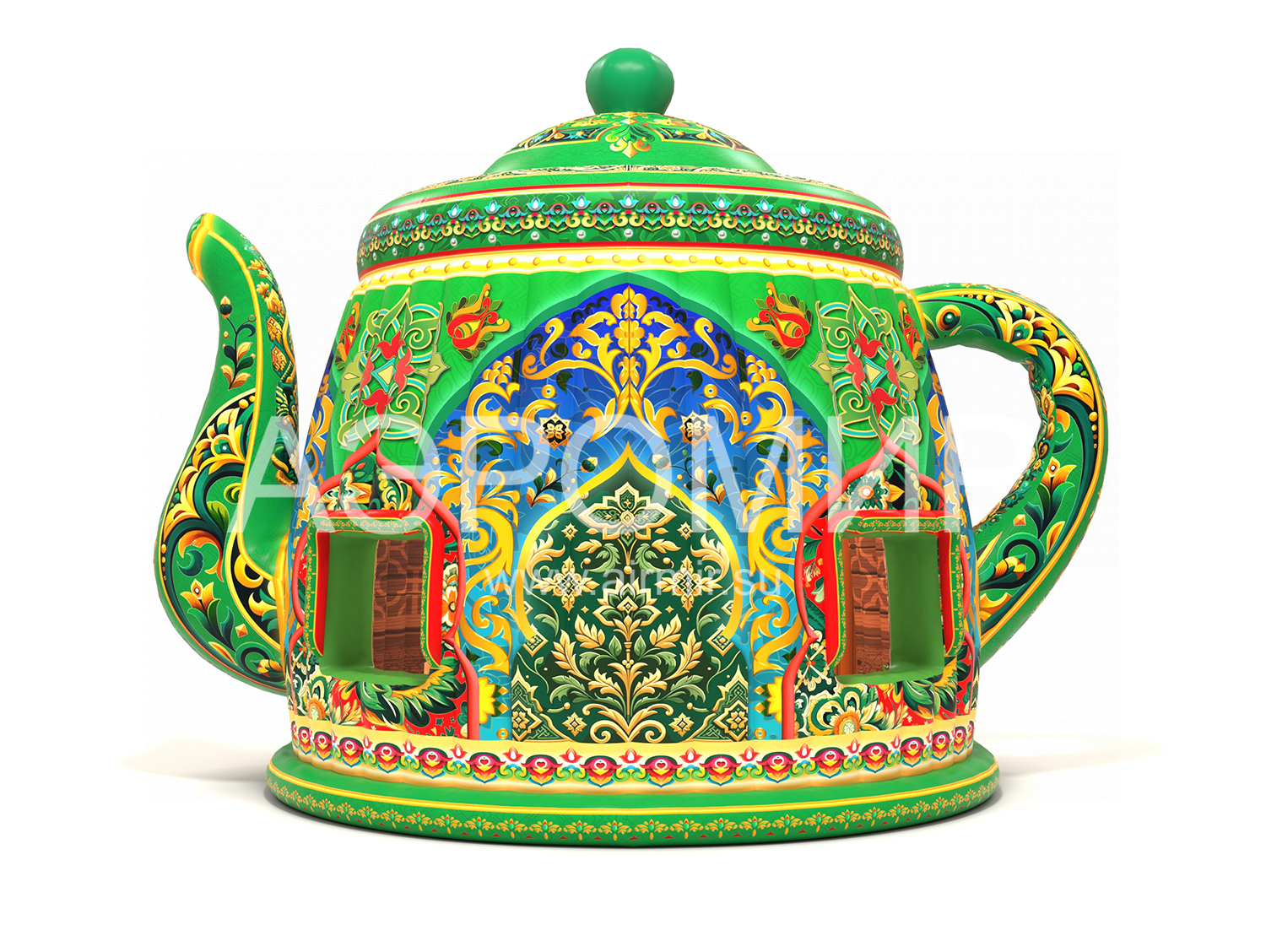 Огромный надувной дом в виде чайника, роспись традиционными русско-народными узорами. Снаружи и внутри фотопечать, есть несколько готовых вариантов росписи. Может использоваться как фотозона, место проведения мастер-классов, выставок, ярмарок. Гарантия 1 год, доставка в любую точку.