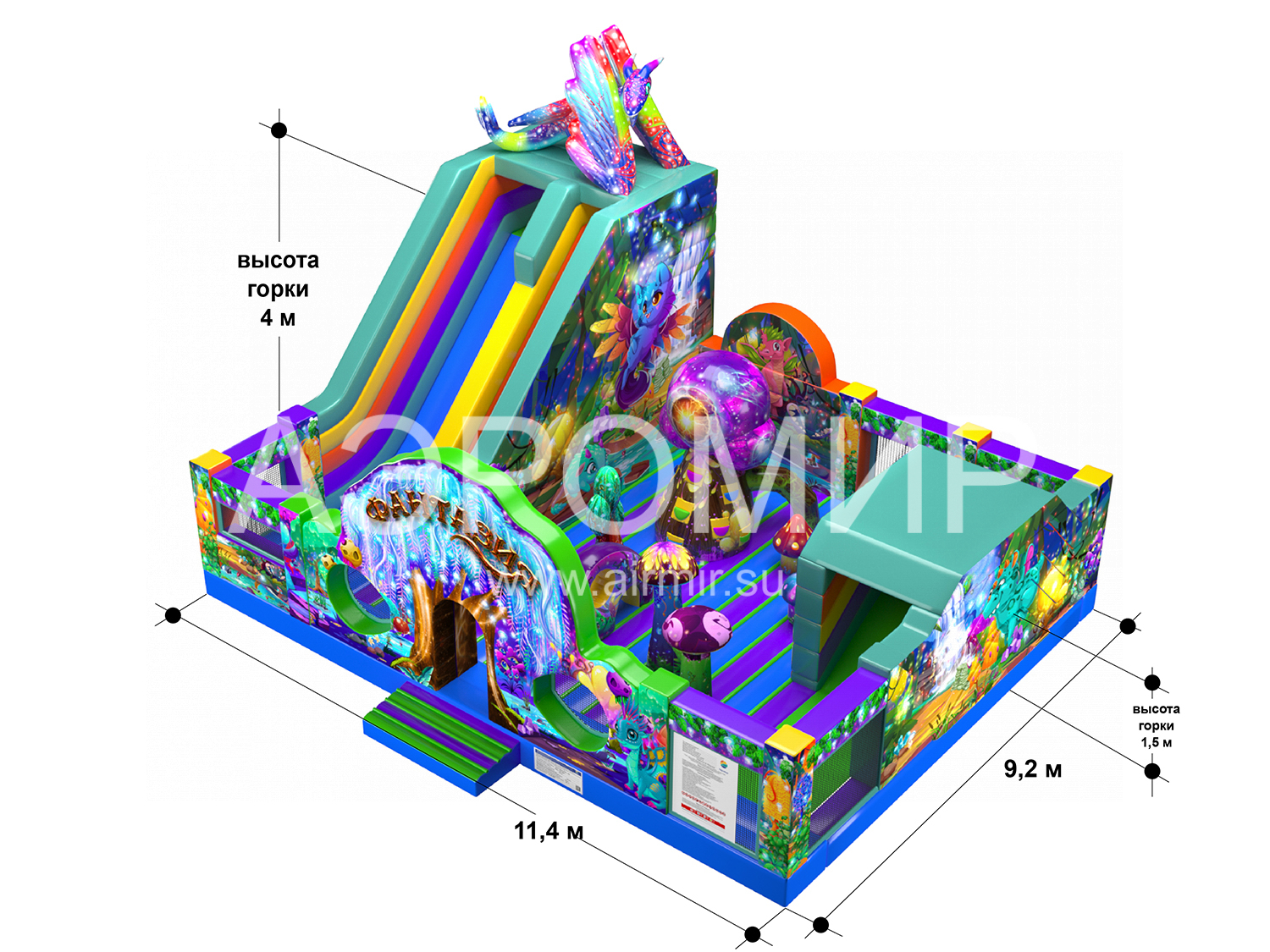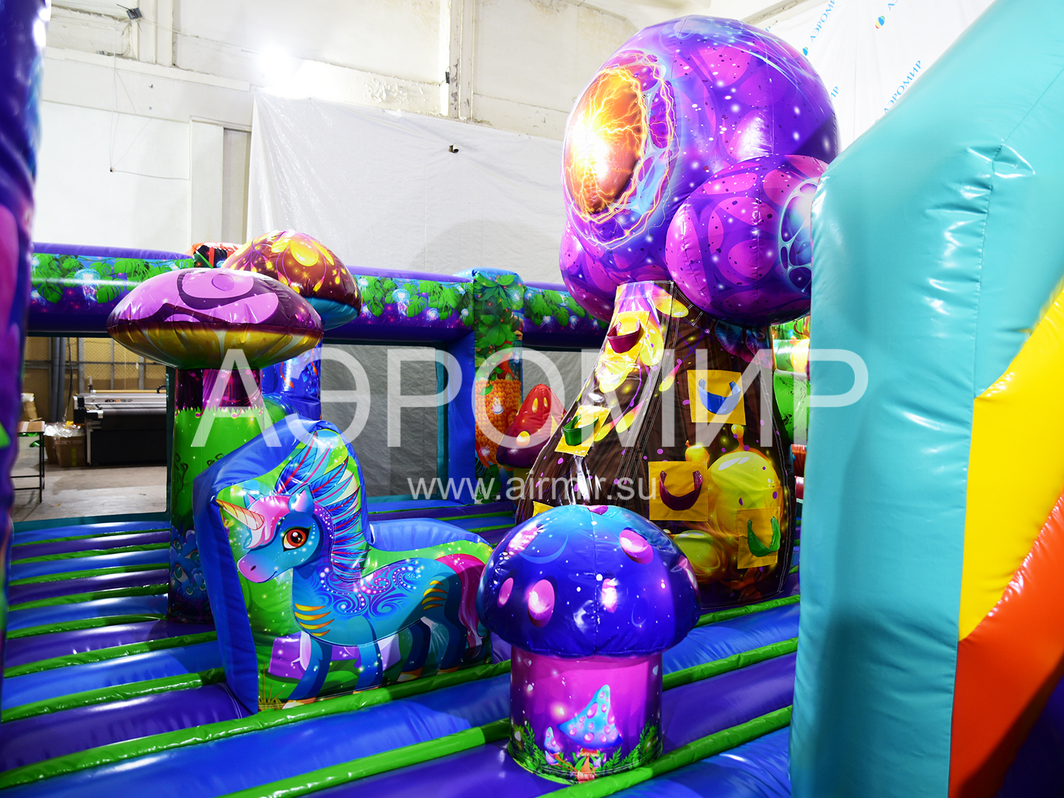 Невероятно красивый батут в яркой печати с тематикой фэнтези. Детей окружают единороги, волшебные динозавры, растения, грибы, дракончики. Внутри батута горка высотой 2,5 метра, игровые надувные элементы, качалки, лазалки и прыжковую зону со скалодромом.