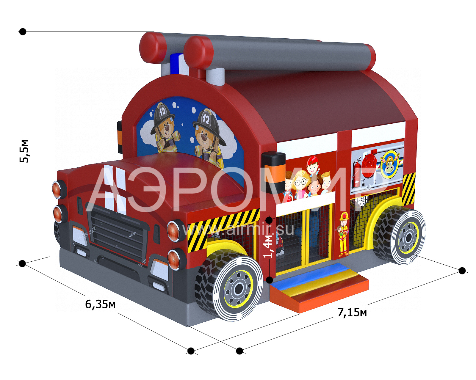 Детский надувной батут Пожарная машина! Это новинка нашего производства. Снабжен крыше, что защищает батут от незначительных осадков и палящего летнего солнца. Реалистичный вид и высокая степень детализации аттракциона никого не оставят равнодушным, особенно поклонников профессии пожарный. Внутри батута расположилась маленькая горка, высотой 1,4 м, игровые элементы и надувные препятствия.