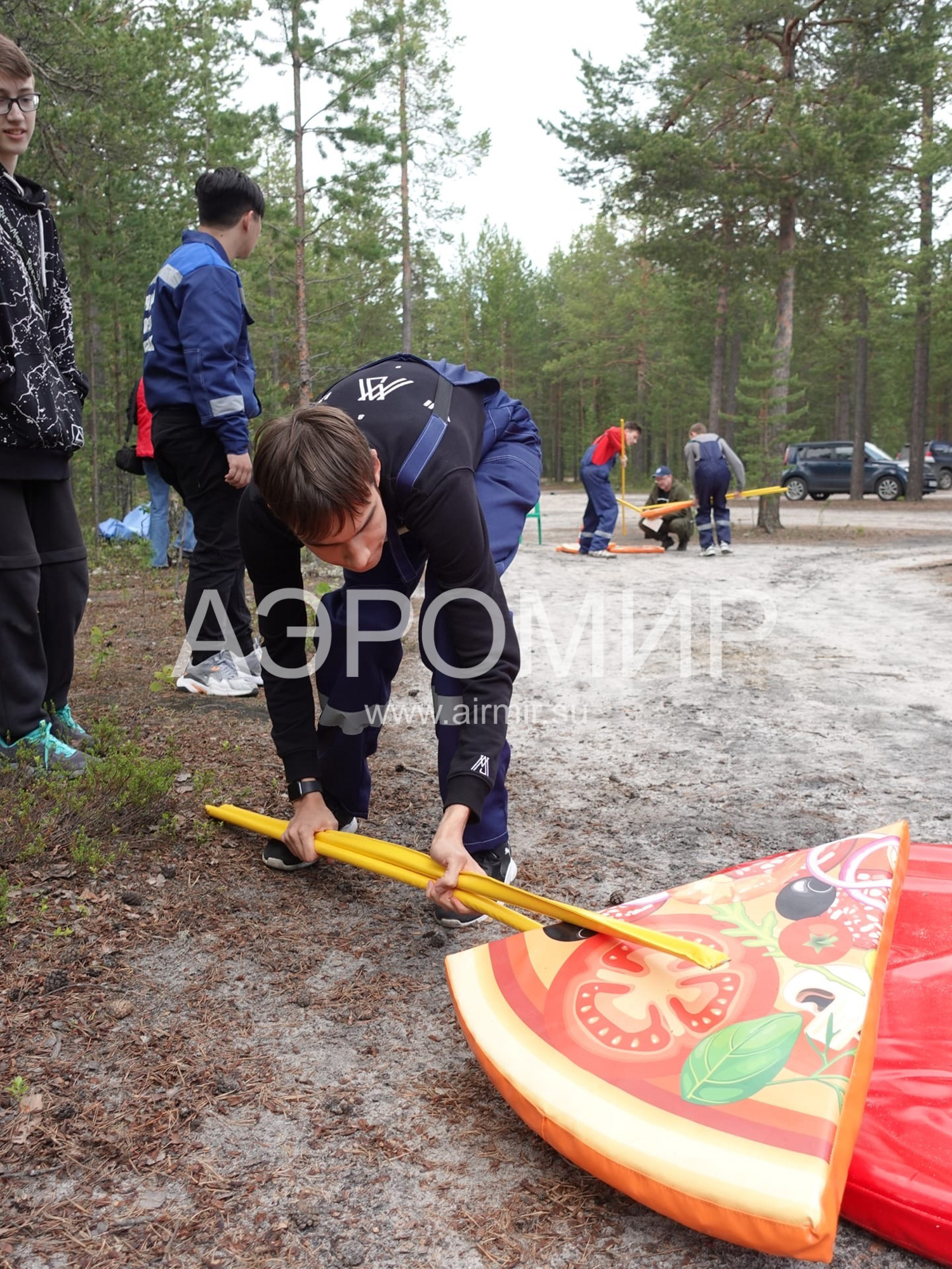 Задача: нескольким участникам с помощью специальных палок нужно донести круг пиццы до финиша, не выронив ни одного куска. Выигрывает та команда, которая первой доставила круг целым до финиша.